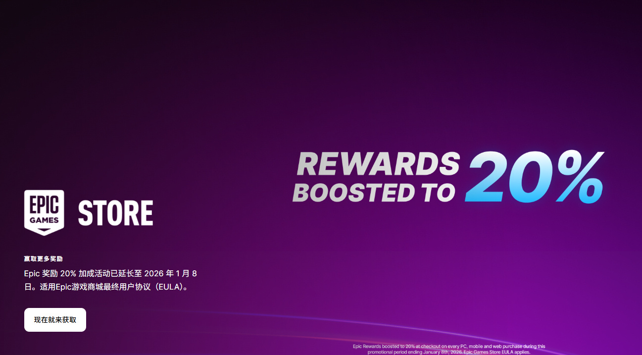 IT之家 8 月 30 日消息,Epic 游戏商城今日宣布,20% 返利的活动原计划在本月末结束,现在将延期 26 年 1 月 8 日。