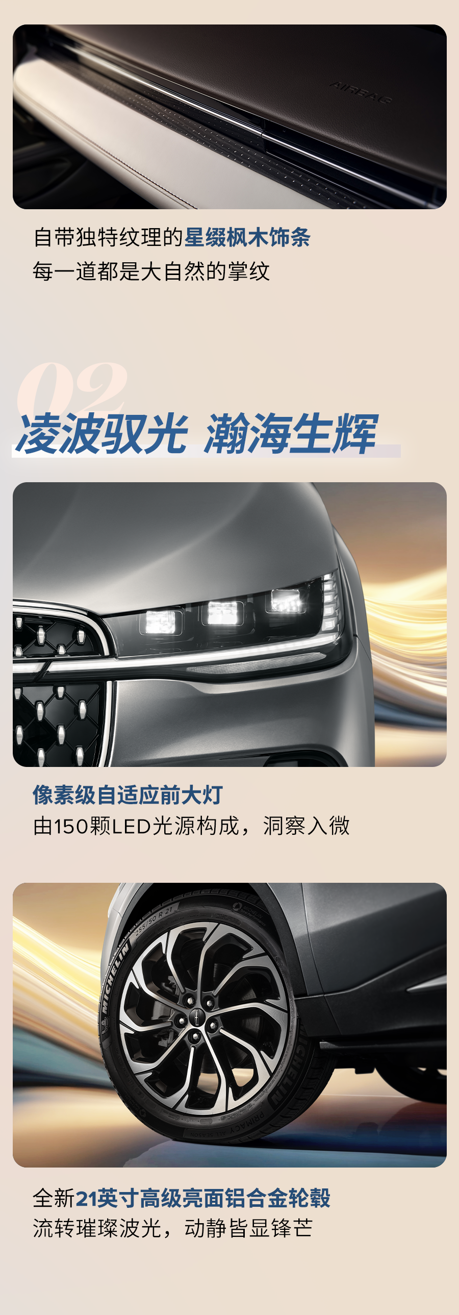 林肯航海家定位为中型 SUV,长宽高 4908/1952/1717mm,轴距 2900mm。此外,航海家总裁版配备自适应前 LED 大灯和 21 英寸轮圈。同时新车还提供隐藏式门把手、悬浮式车顶以及贯穿式尾灯。