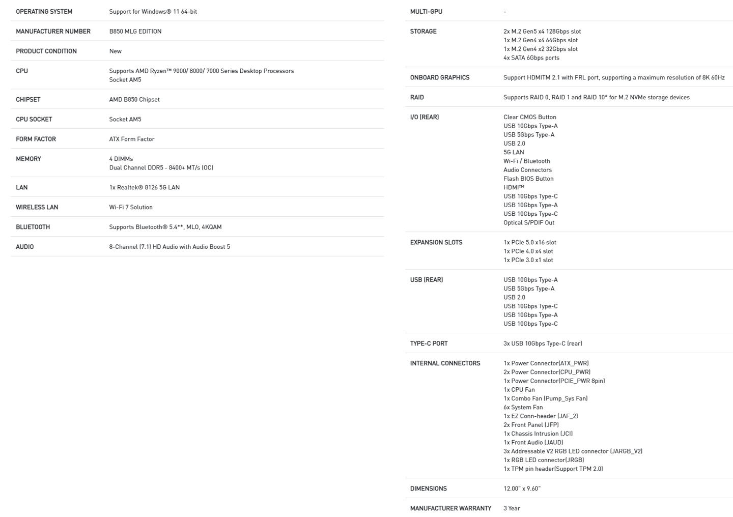 官方信息显示,B850 MLG 主板采用 ATX 规格,具备 14+2+1 相供电,并支持丰富的扩展接口及最新连接标准。需要注意的是,该系列为限量发售。