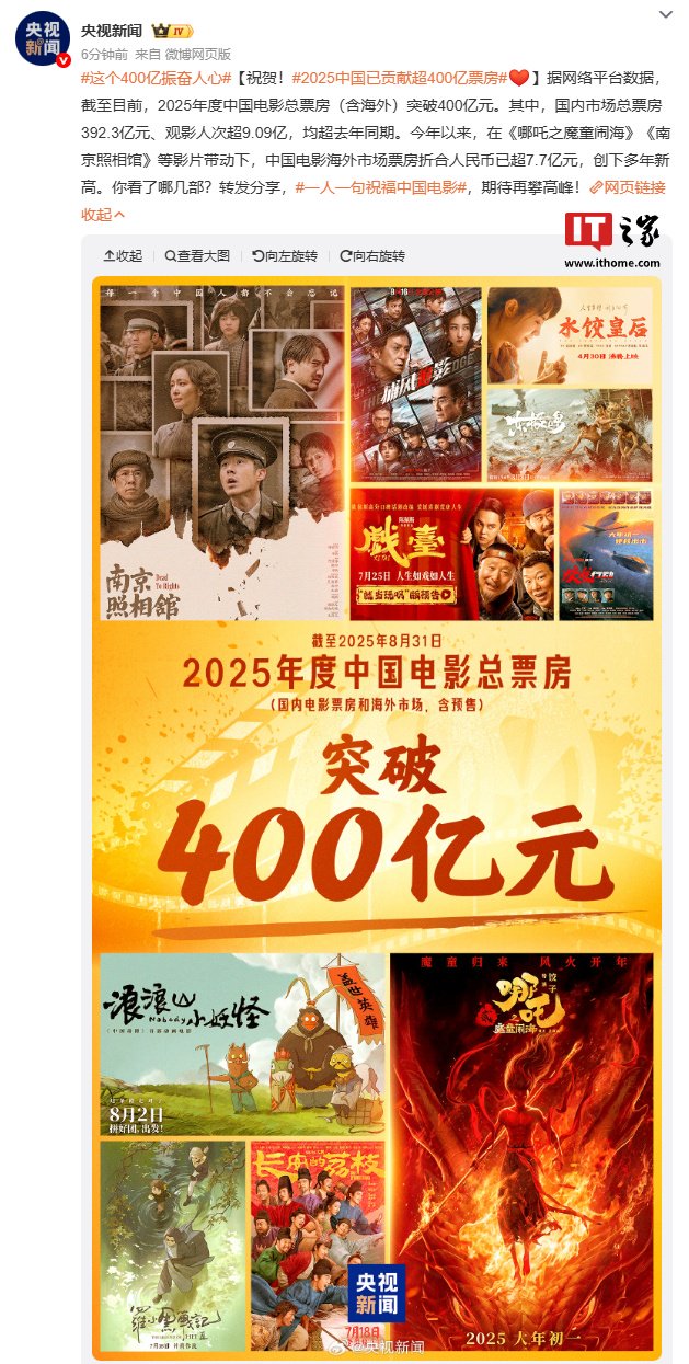 IT之家 8 月 31 日消息,据央视新闻报道,截至目前,2025 年度中国电影总票房(含海外)突破 400 亿元。其中,国内市场总票房 392.3 亿元、观影人次超 9.09 亿,均超去年同期。