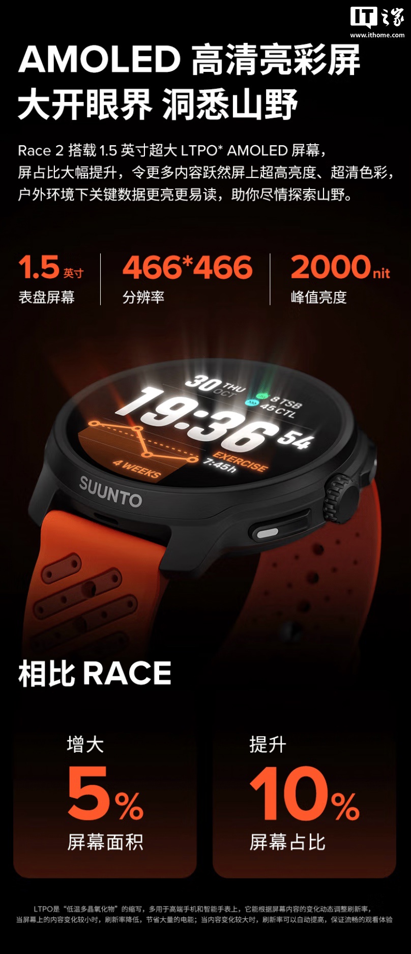 据介绍,RACE 2 智能手表相对于初代主要将手表屏幕从 1.43 英寸调整为 1.5 英寸(466x466 分辨率,2000 尼特峰值亮度)。厚度由 13.3mm 减为 12.5mm,其中精钢版(含表带)重量为 75 克,钛合金版(含表带)重量为 65 克。