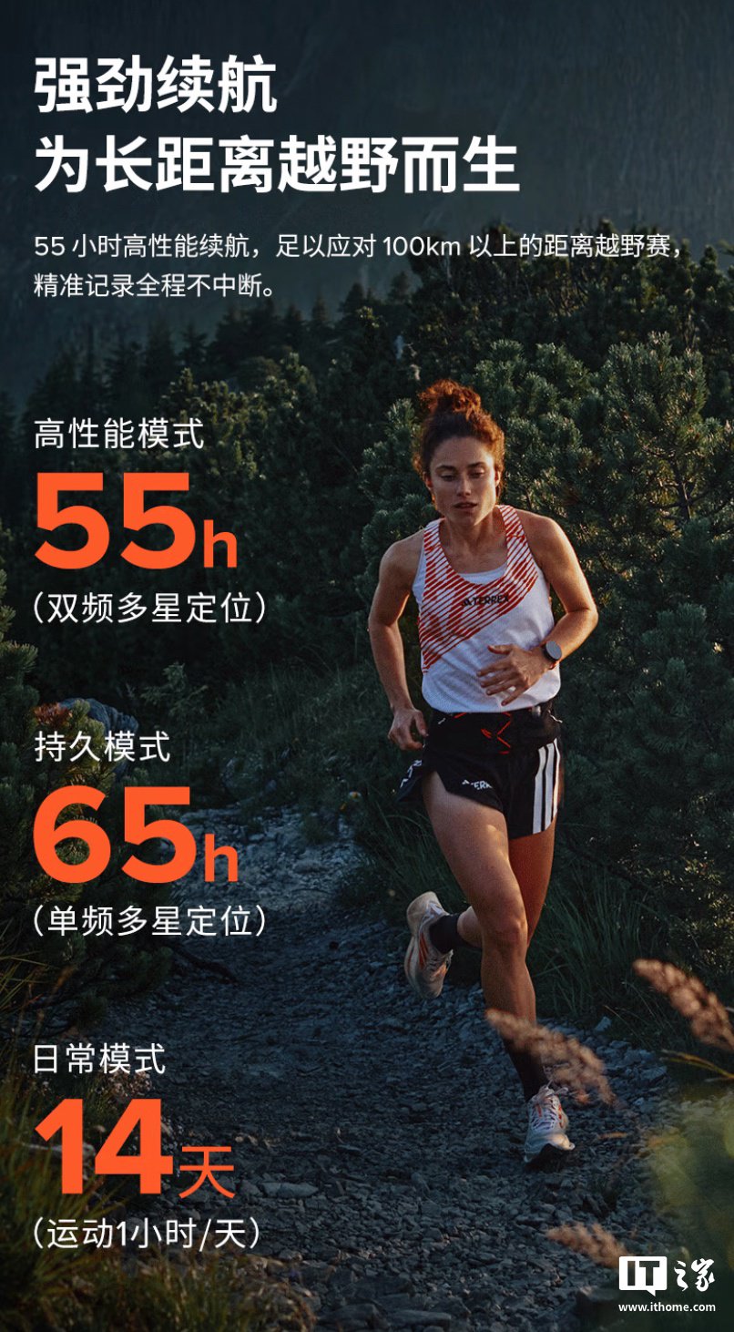 该表配备 4PD 心率模组,同时提供血氧、加速度、陀螺仪、指南针、气压计、温度计传感器,支持百米防水。手表内置 115 种运动模式,在持久模式下拥有 65 小时续航,在日常模式下至高拥有 14 小时续航。