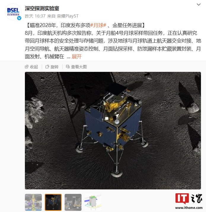 IT之家 8 月 31 日消息,据深空探测实验室分享,印度航天机构 8 月多次报告称,关于月船 4 号月球采样带回任务,正在认真研究带回月球样本的安全处理与存储问题,涉及地球与月球轨道上航天器交会对接、地月空间导航、航天器精准姿态控制、月面钻探采样、防泄漏样本贮藏装置封装、月面发射、机械臂在轨转移样本、地球大气层再入热防护等技术难题。目前,印度模拟与地面测试、评审工作正在陆续开展。