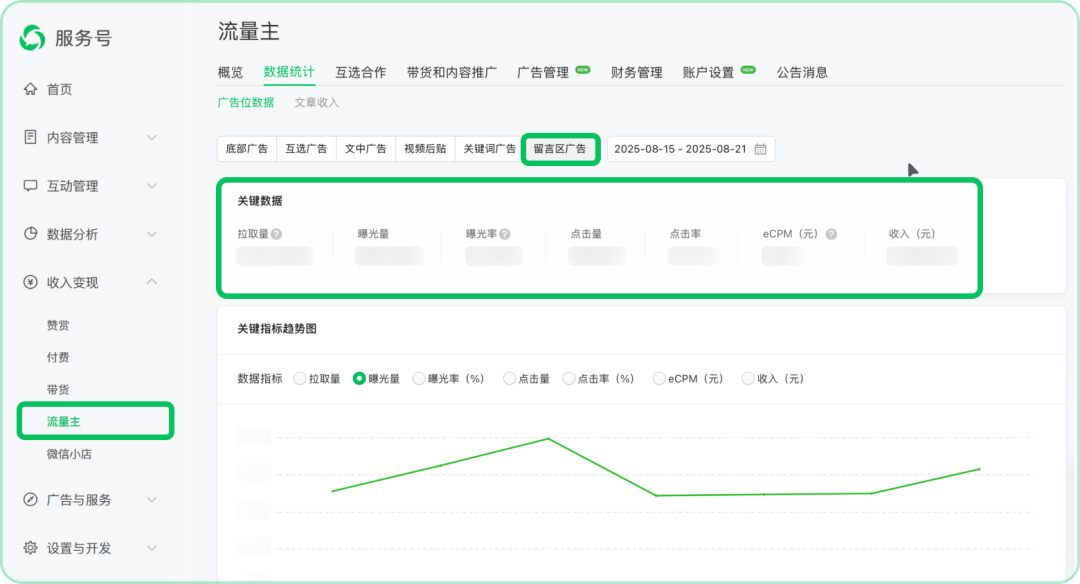创作者可在“微信公众平台 - 收入变现 - 流量主 - 数据统计”页面,查看公众号留言区广告收益数据,包含曝光量、点击量、eCPM、收入等详细指标,便于及时了解收益情况,优化变现策略。