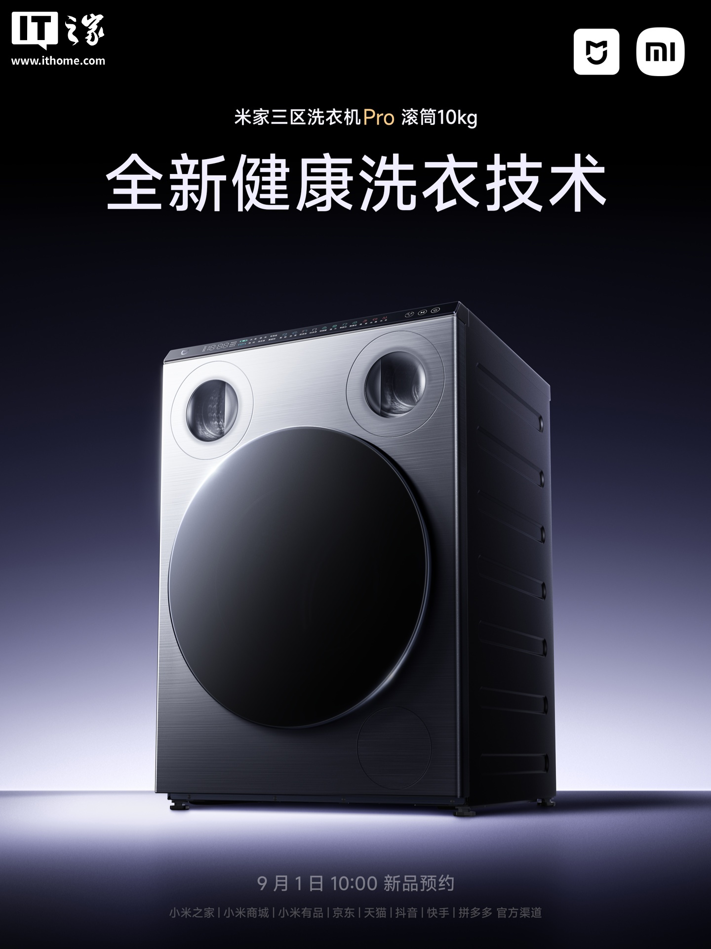 IT之家 9 月 1 日消息,小米今日公布了旗下首款三区洗衣机,米家三区洗衣机 Pro 滚筒 10kg 开启预约。