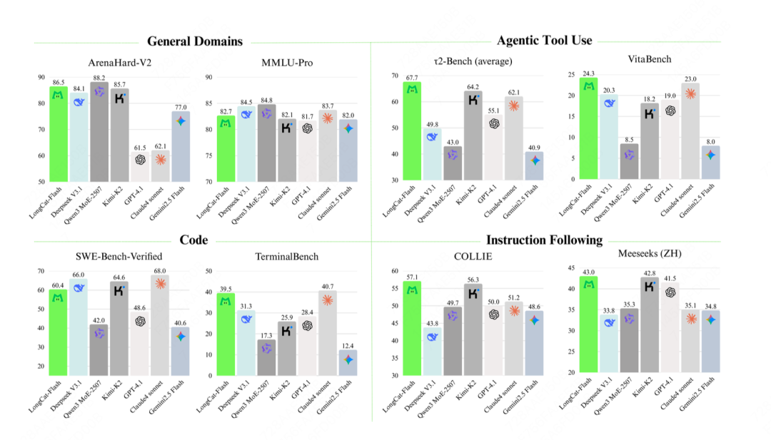 在指令遵循方面,LongCat-Flash 在 IFEval(指令遵循评估基准)中以 89.65 的得分位列第一;此外,在 COLLIE(中文指令遵循基准)和 Meeseeks-zh(中文多场景指令基准)中也斩获最佳成绩,分别为 57.10 和 43.03,凸显其在中英文两类不同语言、不同高难度指令集上的驾驭能力。