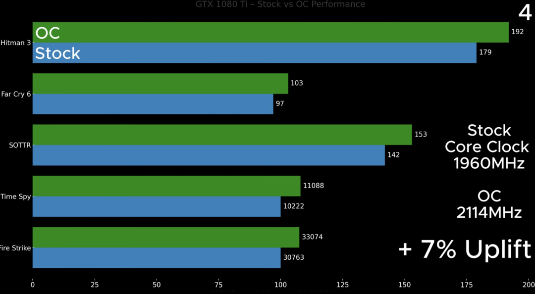 而在 1080 Ti 这边,运行频率从风冷模式下的 1960MHz 飙升至油冷下的 2114MHz,使游戏 FPS 全面提高了约 7%