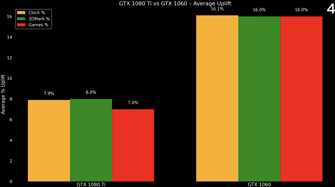 至于为什么在油冷下,1080 Ti 的提升不如 1060?