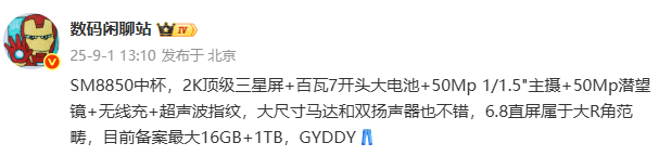 据爆料,该机配备 2K 顶级三星屏 + 百瓦 7 开头大电池 + 50Mp 1/1.5" 主摄 + 50Mp 潜望镜 + 无线充 + 超声波指纹,大尺寸马达和双扬声器也不错,6.8 直屏属于大 R 角范畴,目前备案最大 16GB+1TB。