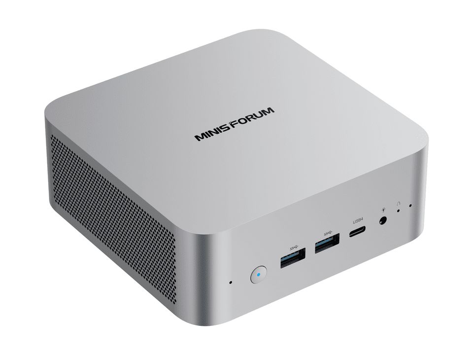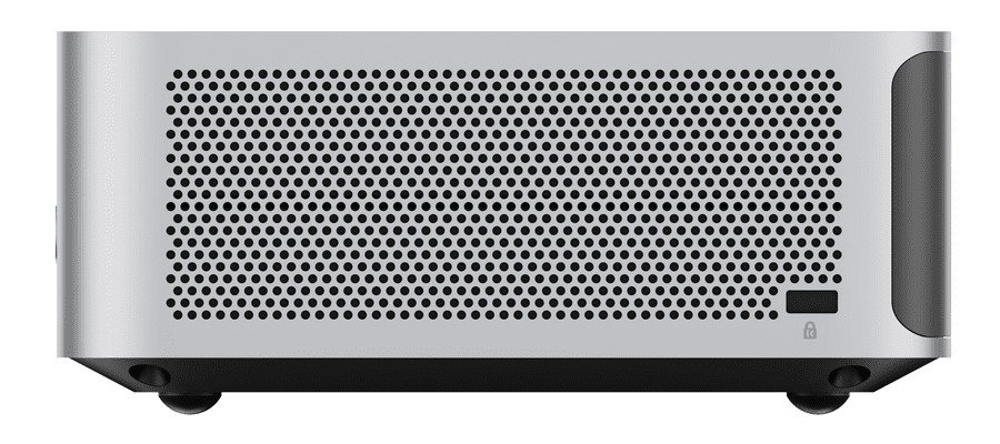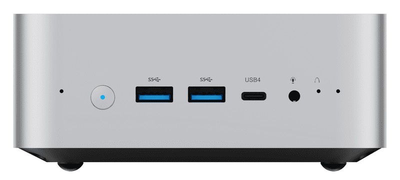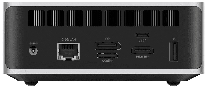 这款迷你主机前方配备电源键、2 个 USB-A 10Gbps、1 个全功能 USB-C 40Gbps、1 个音频插孔;后方则拥有 DC-in 电源插孔、1 个 2.5GbE RJ45 网卡、1 个 DP 1.4、1 个 HDMI 2.1、1 个全功能 USB-C 40Gbps、1 个 USB-A 480Mbps 和 1 个从 M.2 盘位转接的 OCuLink 4i 接口;此外其右侧有一个 Kensington 肯辛通安全锁孔。