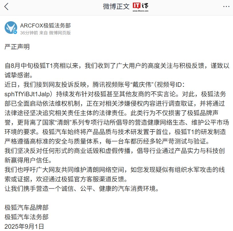 近日,我们接到网友投诉反映,腾讯视频账号“戴庆伟”(视频号 ID:sphTfYiBJt1Jalp)持续发布针对极狐甚至其他友商的不实言论。对此,极狐法务部已全面启动依法维权机制,正在对相关涉嫌侵权内容进行调查取证,并将通过法律途径坚决追究相关责任主体的法律责任。此类行为不仅损害了极狐品牌声誉,更背离了国家“清朗”系列专项行动所倡导的营造健康网络生态、维护公平市场环境的要求。极狐汽车始终将产品品质与技术研发置于首位,极狐 T1 的研发制造严格遵循高标准的安全与质量体系,每一台车都历经多轮严苛测试与验证。
