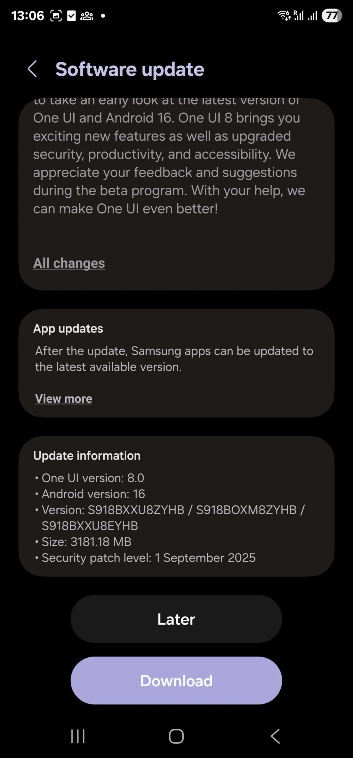 目前,印度地区已正式开放 Galaxy S23、Galaxy S23 + 及 Galaxy S23 Ultra 机型的 One UI 8 测试版申请通道,预计也将很快向其他符合条件的国家和地区开放。此次推送的测试版固件版本号为 S91xBXXU8ZYHB,大小约 3.1GB,同时还包含 2025 年 9 月的安全补丁。