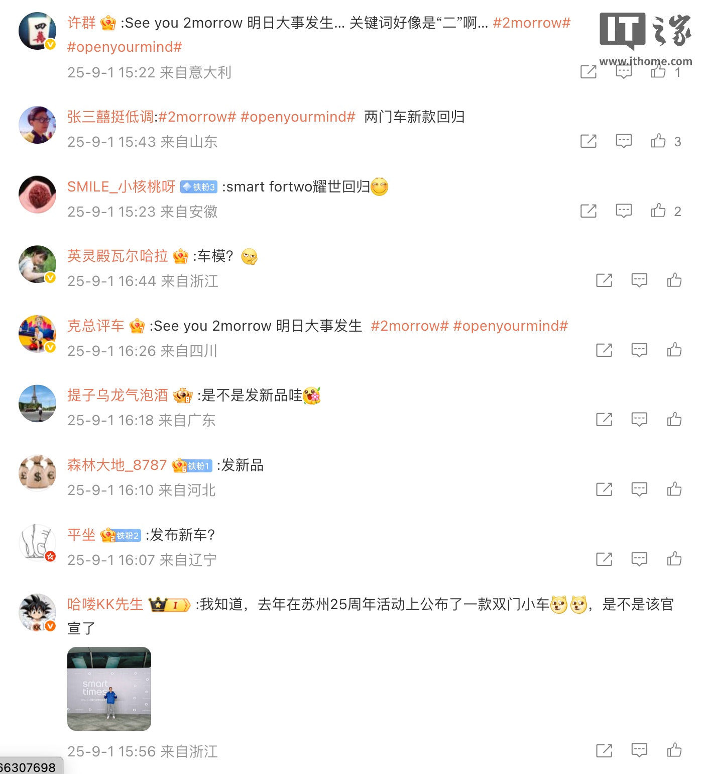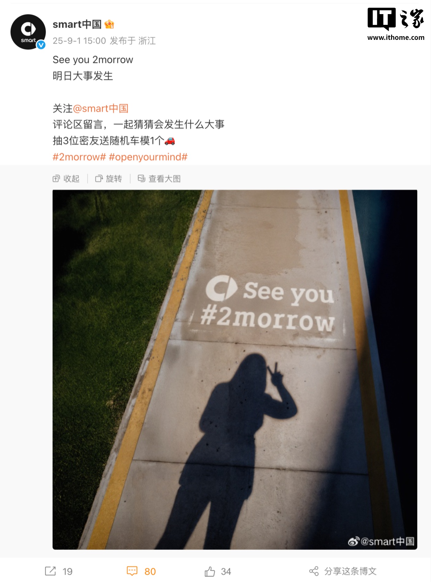 IT之家 9 月 1 日消息,今天下午,smart 中国官微在微博上发文宣布:See you 2morrow,明日大事发生。该微博的配图则是出现了“#2morrow”的字样,引起网友对 smart #2 新车的期待。
