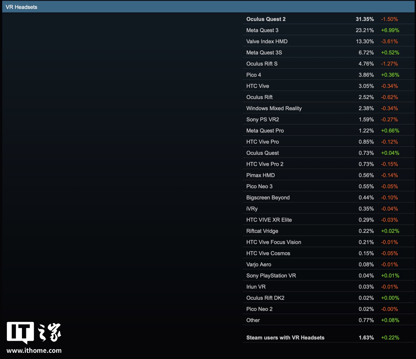 在 VR 头显方面,Meta Quest 2 头显仍最受欢迎,本月相应头显占比 31.35%,下跌 1.50%;Meta Quest 3 头显占比 23.21%,上升 6.99%。