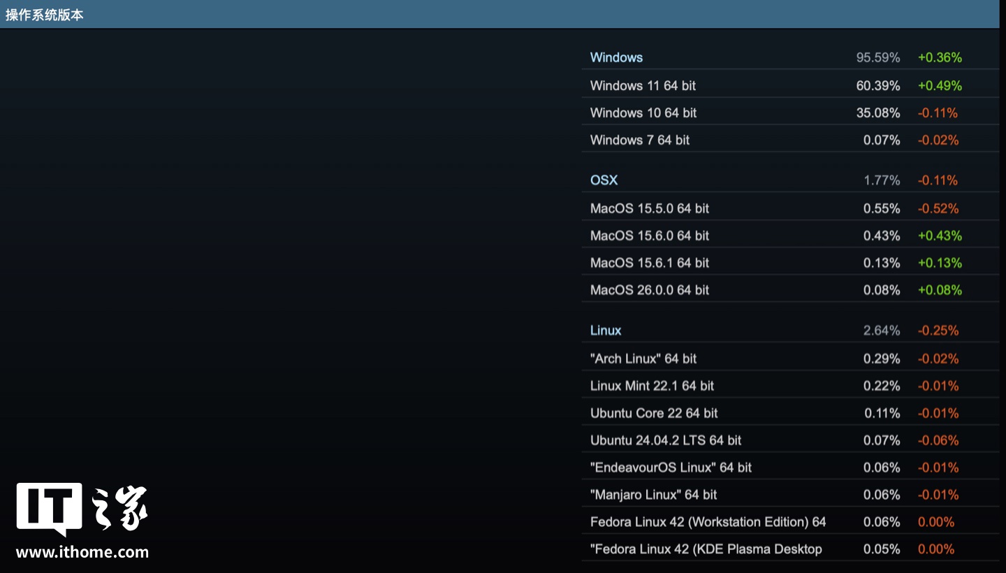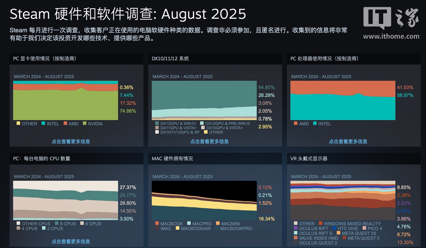 IT之家 9 月 2 日消息,Steam 平台今天公布了 2025 年 8 月的硬件调查报告,英伟达 RTX4060 桌面版显卡最受欢迎,玩家仍惯用 16GB RAM、1920x1080 分辨率产品。