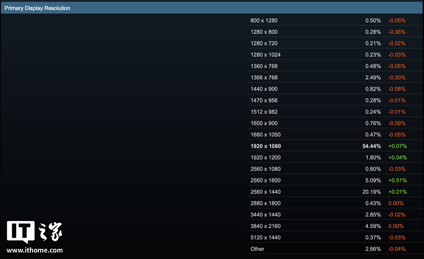 在显示器分辨率方面,1080P(1920x1080 分辨率)显示器仍最受欢迎,本月上升 0.07%,占比 54.44%。而 2K(2560x1440 分辨率)显示器排行第二,占比 20.19%,本月上升 0.21%,这证明玩家显示器分辨率呈逐渐上升趋势。