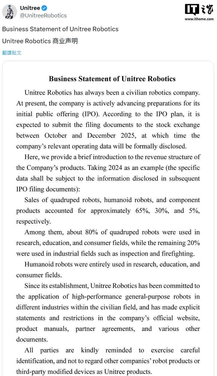 IT之家 9 月 2 日消息,宇树科技今天在 X 平台发布声明,宣布公司即将在今年第四季度(10 月-12 月)向证券交易所提交上市申请文件。