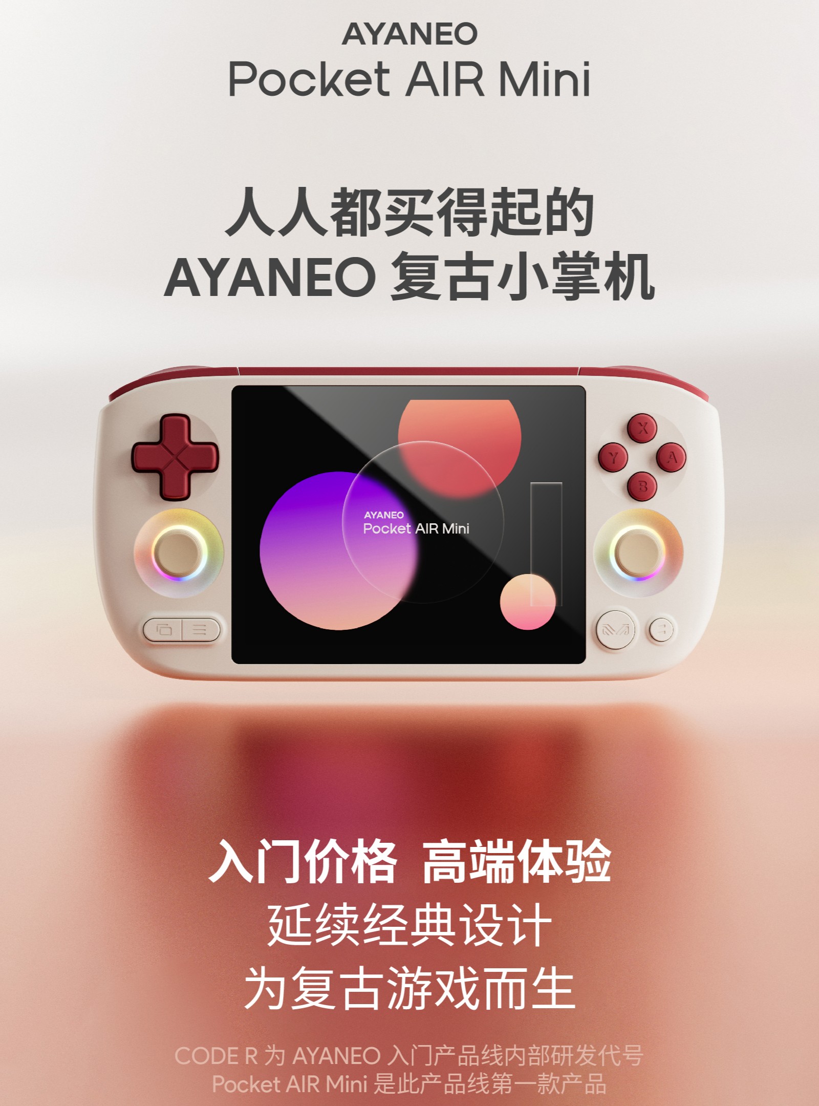 IT之家 9 月 2 日消息,AYANEO 今日正式确认了其 "CODE R" 入门级产品线的首款产品 Pocket AIR Mini 复古小掌机。该型号宣称“人人都买得起”,定位性价比级。
