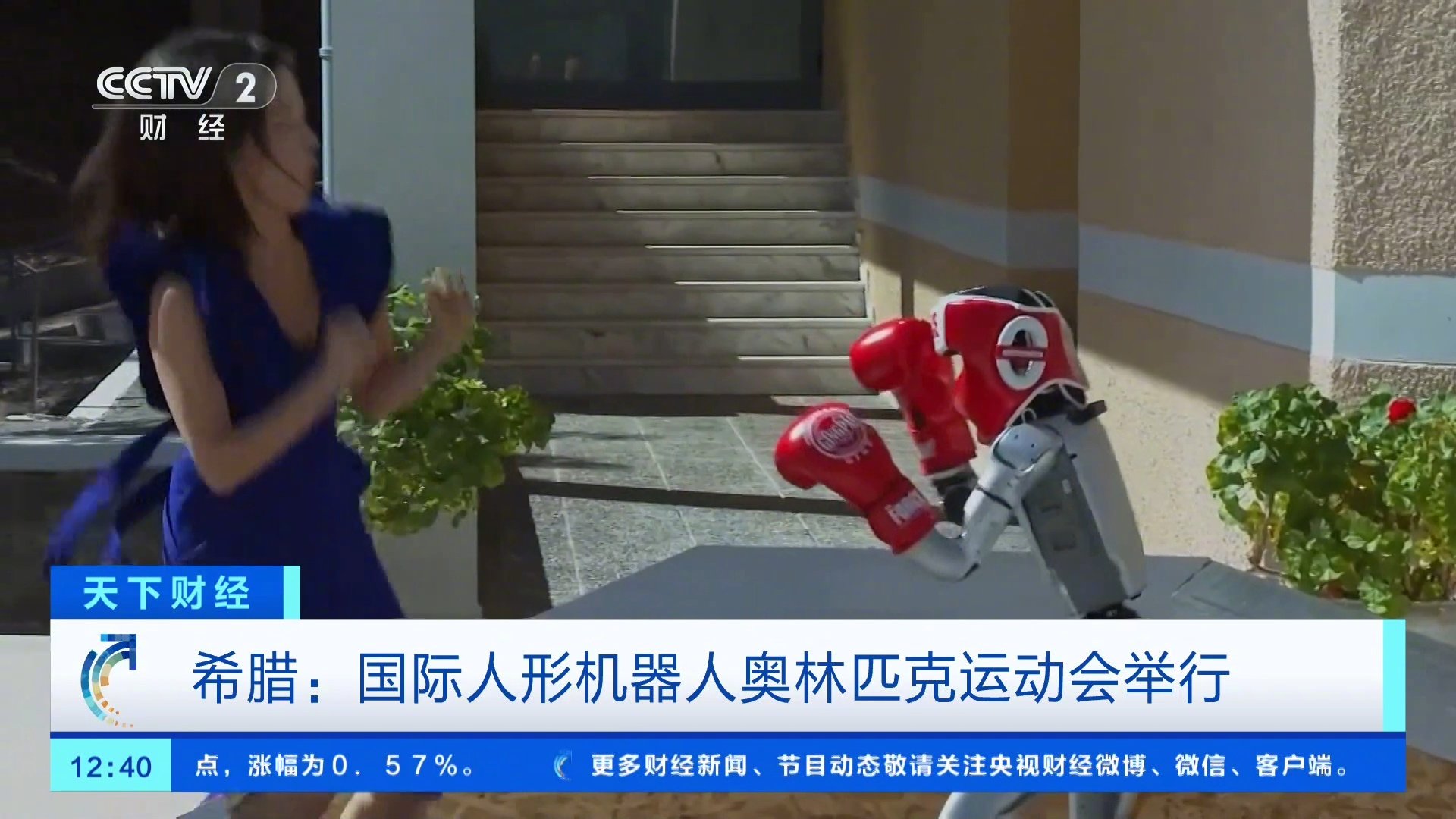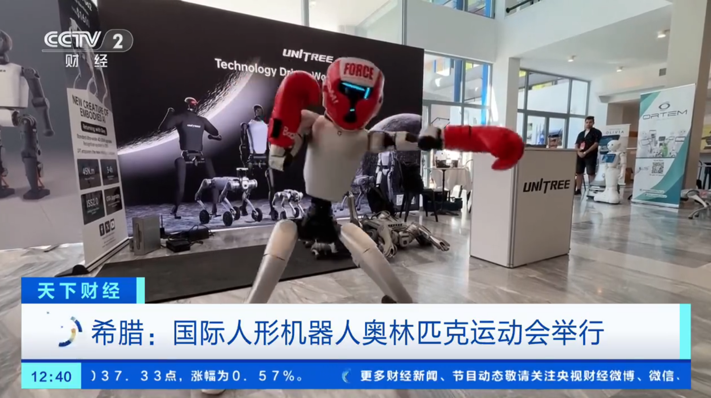 从报道中可以看到,国内的宇树科技也前往希腊参加了该运动会,展示拳击等技能。背景板显示为“首届国际人形机器人奥运会”。