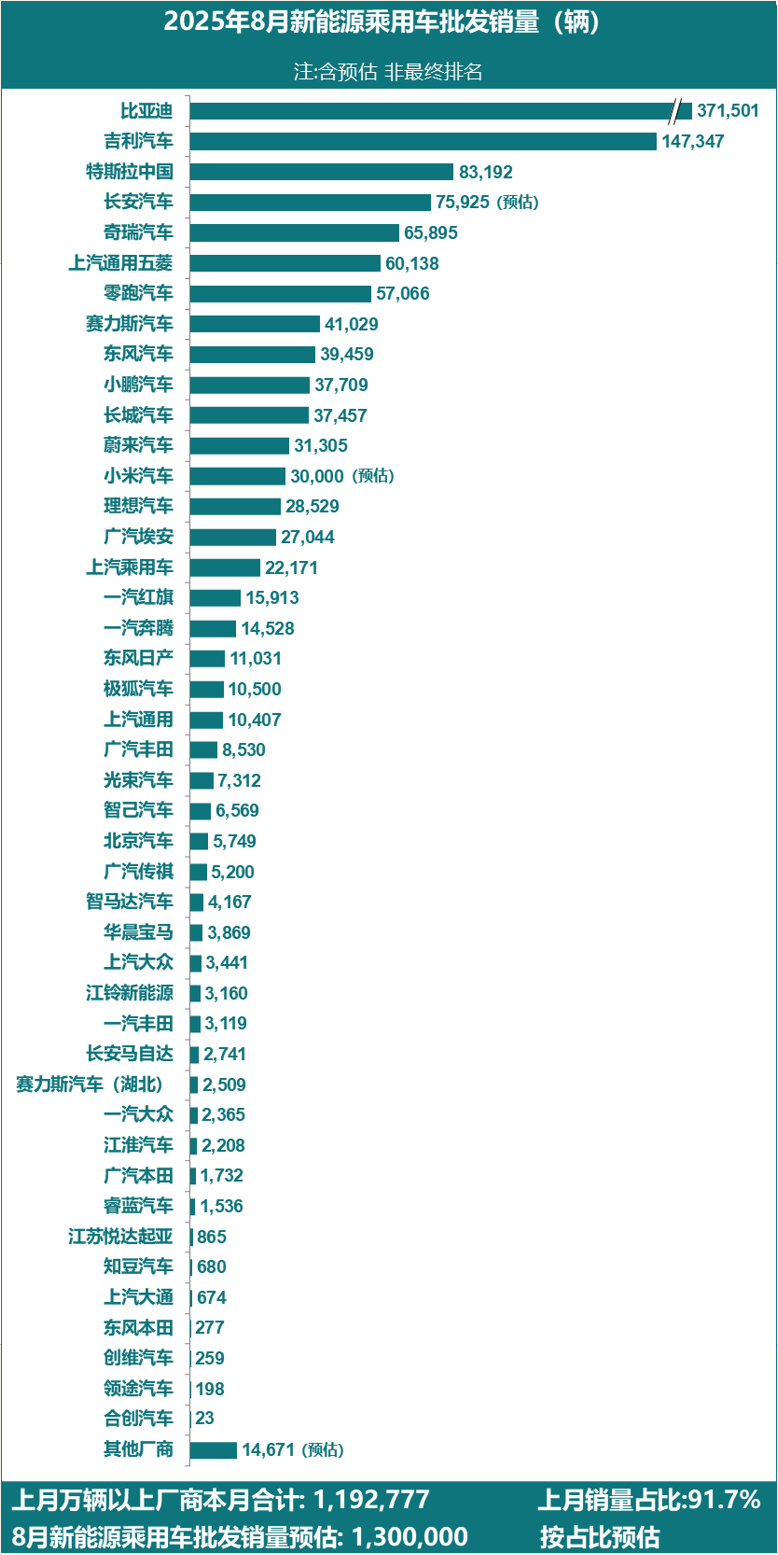 此外,赛力斯汽车实现 41,029 辆批发销量,小鹏汽车 37,709 辆,理想汽车 28,529 辆,小米汽车则预计达到 30,000 辆。广汽埃安、蔚来汽车分别为 27,044 辆和 31,305 辆。