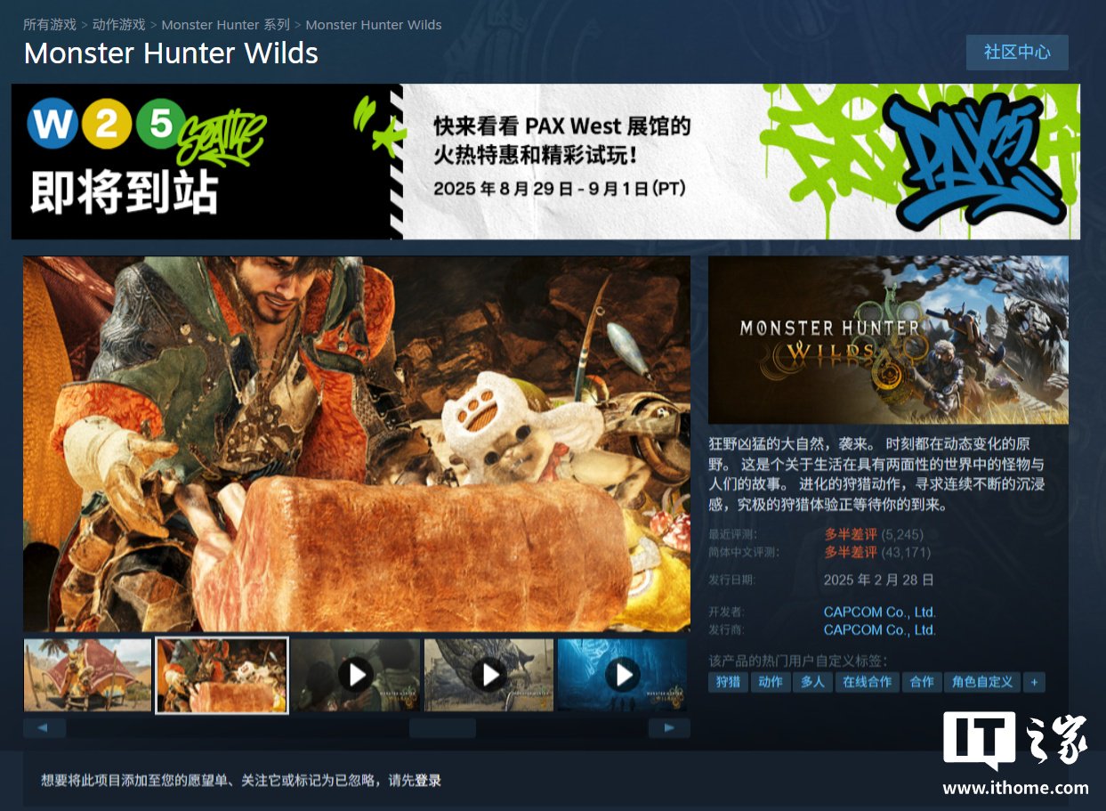 IT之家查询 Steam 平台后发现,《怪物猎人:荒野》游戏主打“多人共斗”体验,国区售价 348 元起,目前玩家整体评价为“多半差评”。
