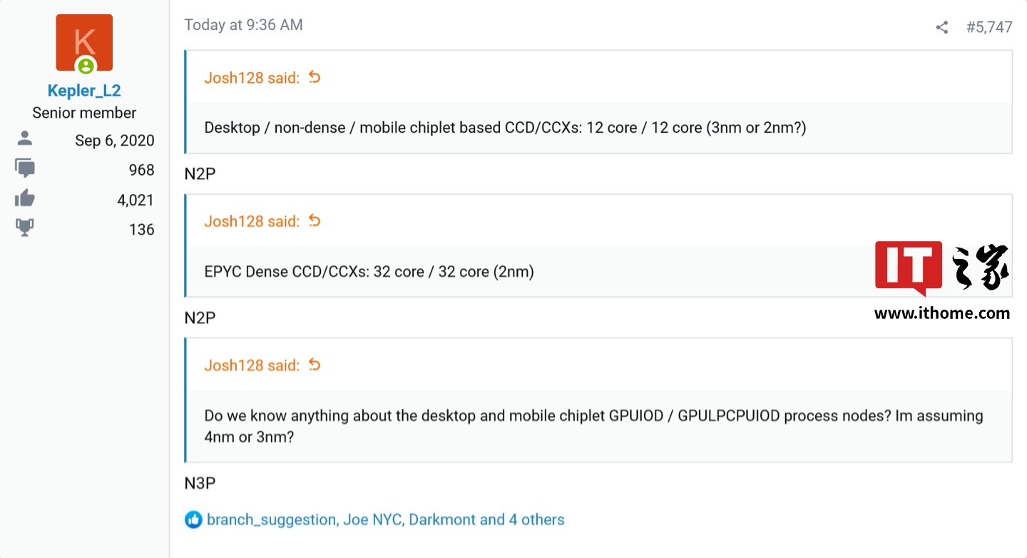 Kepler_L2 同时确认,"Zen 6" 微架构桌面、移动处理器(以及标准版 EPYC "Venice" 服务器处理器)使用的 12 核标准型 "Zen 6" CCD 芯片采用台积电 N2P 制程工艺、EPYC "Venice" 使用的高密度 32 核 "Zen 6c" CCD 芯片也将采用 N2P 制程。