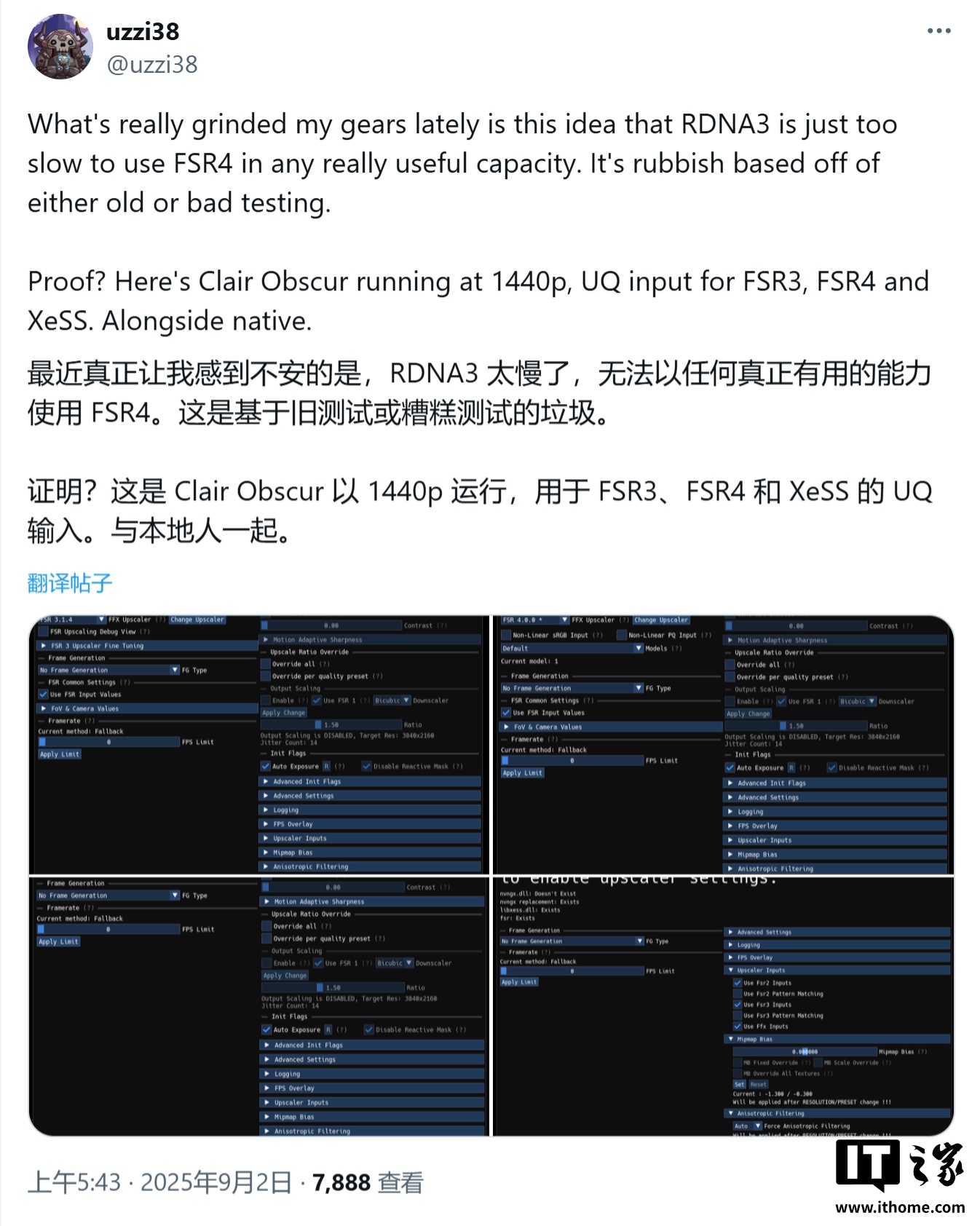 推特用户 @uzzi38 在 Radeon RX 7800 XT 显卡上进行了实际测试。在游戏《光与影:33 号远征队》中,以 1440p 分辨率和超高画质预设对比了多种超分辨率技术的表现。IT之家附上截图如下: