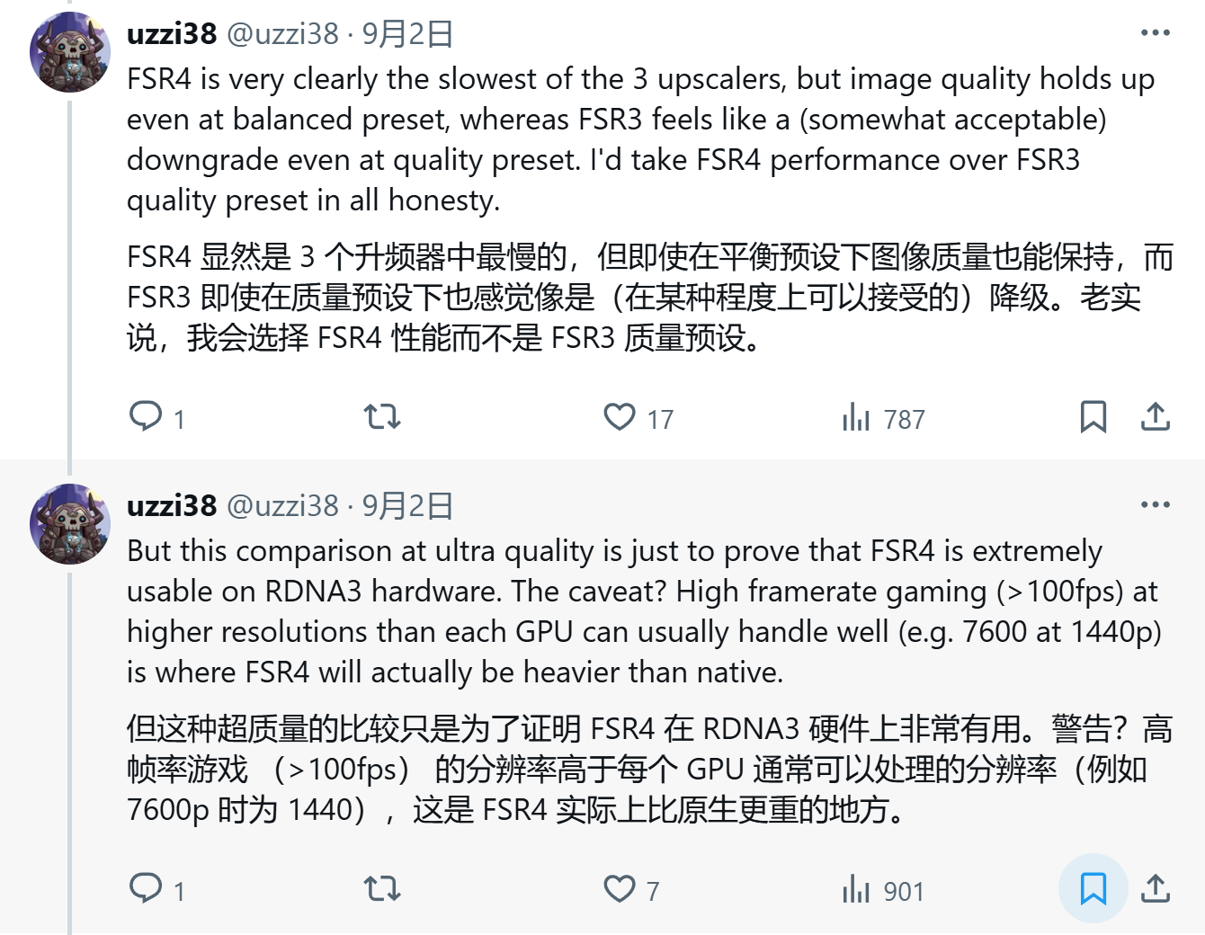 测试指出,FSR 4 的质量和平衡预设即使在画质和稳定性上也优于 FSR 3.1 的超级质量模式。这表明尽管存在性能损耗,FSR 4 仍能为 RDNA 3 用户带来更优的视觉体验。不过,这一结论仍需在更多游戏中验证。