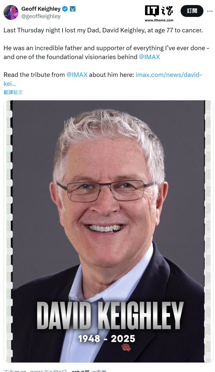 IT之家 9 月 3 日消息,IMAX 官方昨天发布新闻稿,宣布 IMAX 首位首席品监官大卫・基利已于 9 月 2 日逝世,享年 77 岁,他在 50 多年的工作生涯中保障了 IMAX 电影的观看体验,监督了 500 多部电影的后期制作。