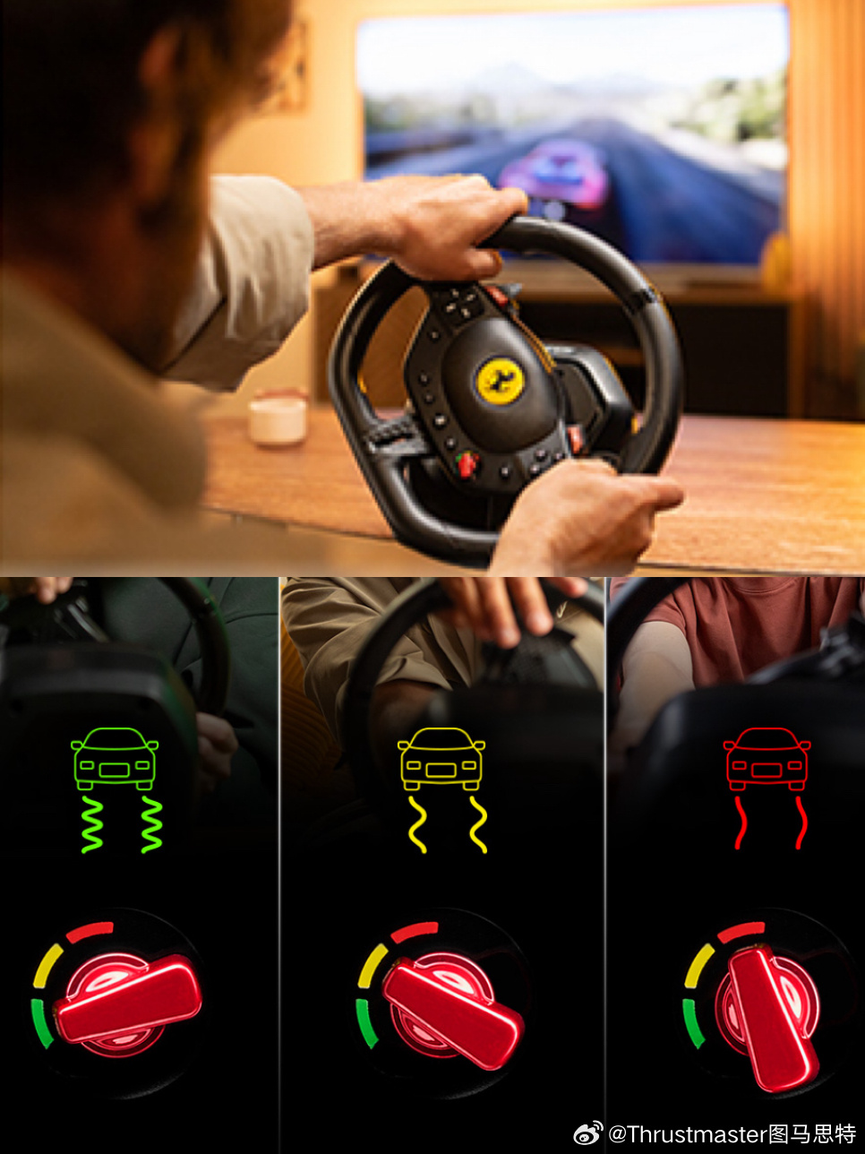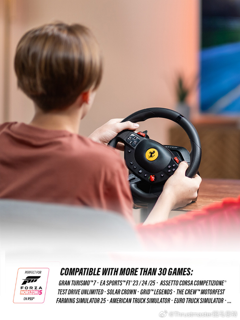 IT之家从官方介绍获悉,该方向盘即插即用,获得 PlayStation 和法拉利官方授权,适合所有类型的游戏(GT、F1、Trucking、Farming、拉力赛、街机赛车等),PS4、PS5、PC 都能用,未来还有支持 Xbox 的版本。