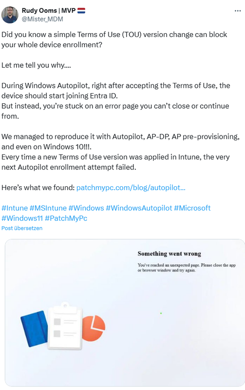 近期有管理员反馈,在部署过程中选择同意最新 TOU 时,AutoPilot 会立即卡死,屏幕显示“Something went wrong: You accessed an unexpected page”错误,部署无法继续。这一问题出现在 Windows 10 与 Windows 11 的自动部署中,且在多台设备上已复现。
