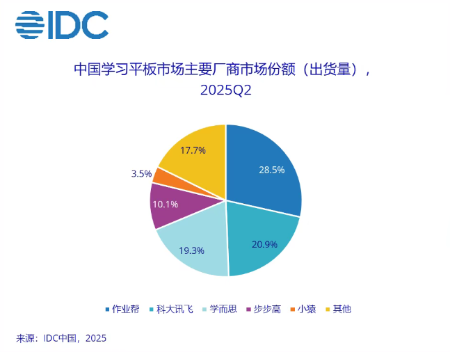 报告称,中国学习平板市场“马太效应”日趋明显,头部厂商依托丰富的内容资源、领先的 AI 能力及完善的渠道布局,不断巩固竞争优势。2025 年第二季度作业帮、科大讯飞、学而思、步步高、小猿位列市场出货量前五,市场份额共计 82.3%。