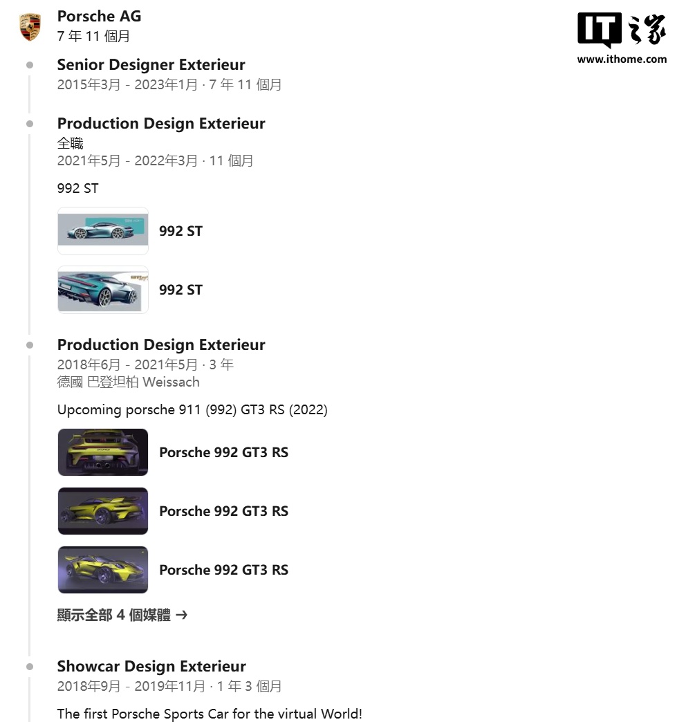 此外,他还在保时捷工作 7 年,担任过概念车设计师、高级外观设计师,代表作品有保时捷 911(992 ST)、718 Boxster 超跑、Vision GT 概念车和 Taycan 原型车 Mission E,拥有丰富设计经验。