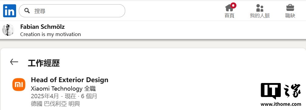 IT之家查询领英后发现,Fabian Schmölz 从 2025 年 4 月开始加入小米,担任小米汽车欧洲外观设计主管,工作地点位于德国巴伐利亚州施瓦布明兴。