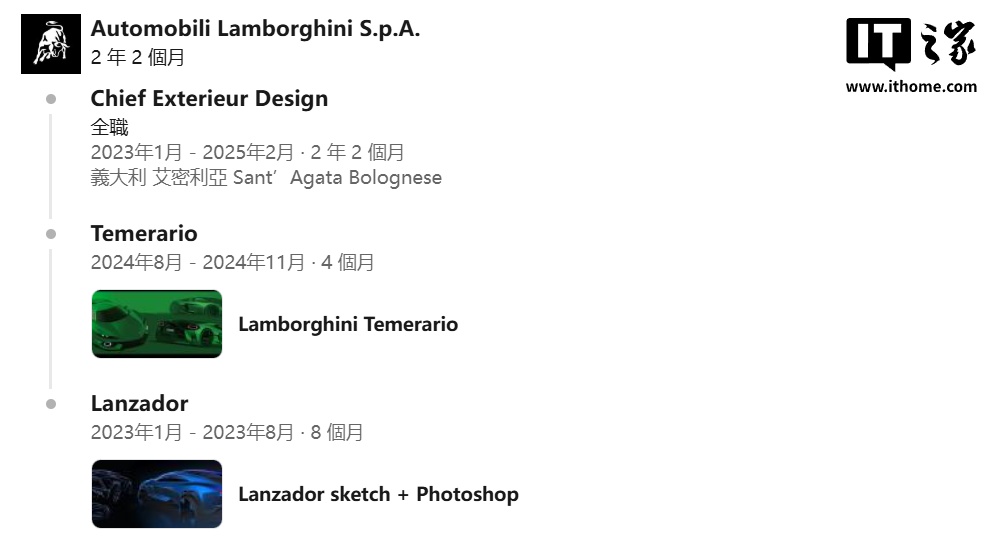 Fabian Schmölz 的履历尤为亮眼,他曾于 2023 年 1 月-2025 年 2 月在兰博基尼担任首席外观设计师,设计了兰博基尼“小牛”Temerario HPEV 混动超跑和 Lanzador 概念超跑的外观。