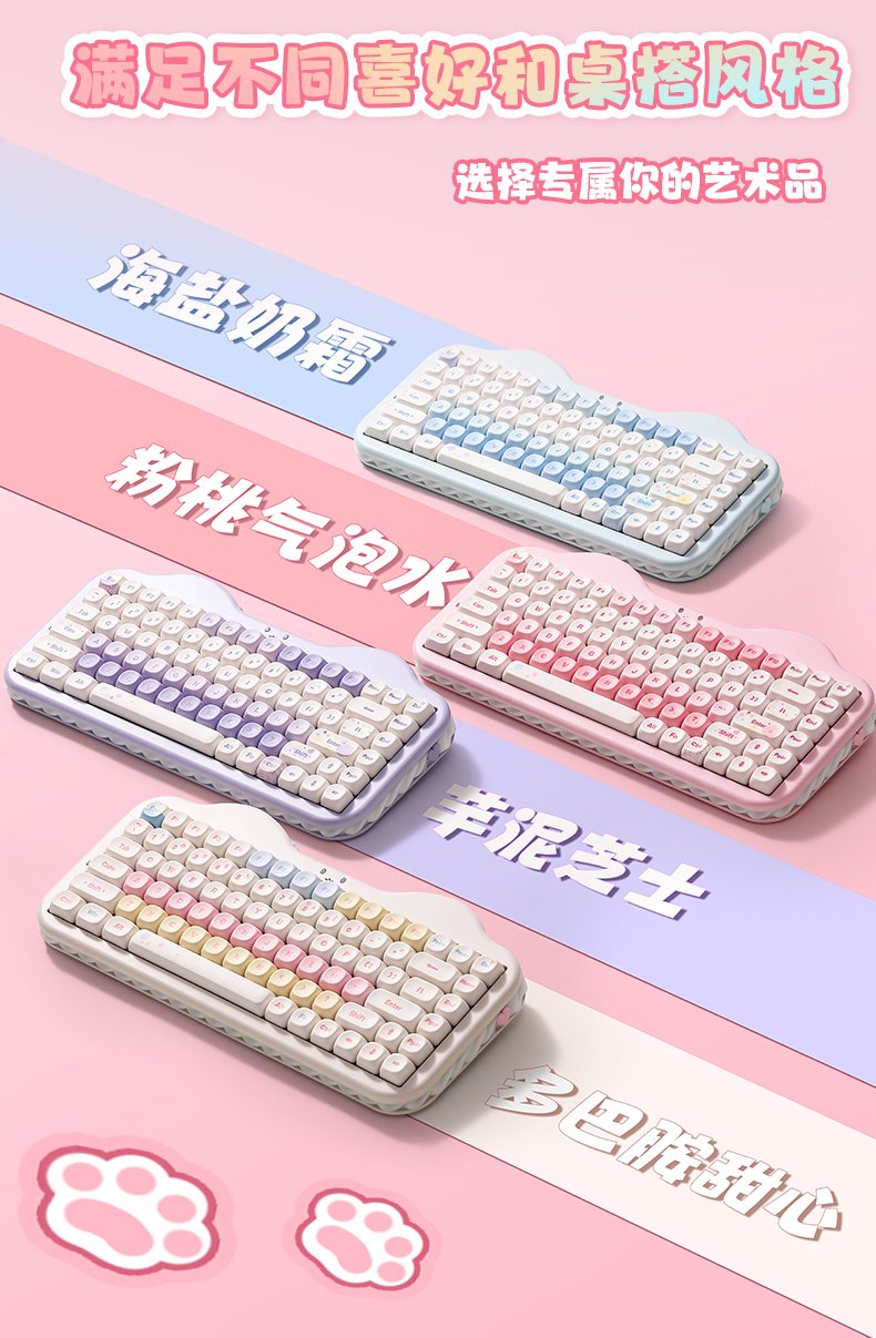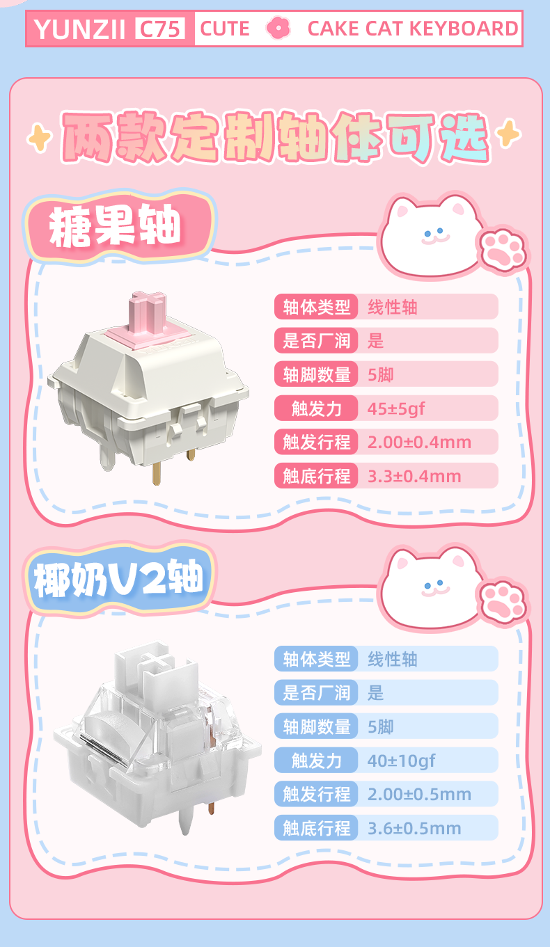 在外观方面,C75 将可爱元素融入了整体设计中,无论是花朵元素键帽、猫猫笑脸状态指示灯,还是“蛋糕奶油夹层”硅胶侧裙装饰件,抑或是猫猫脚垫和小鱼外形 2.4GHz 接收器,均为该硬件设备添加了一份甜蜜气息。