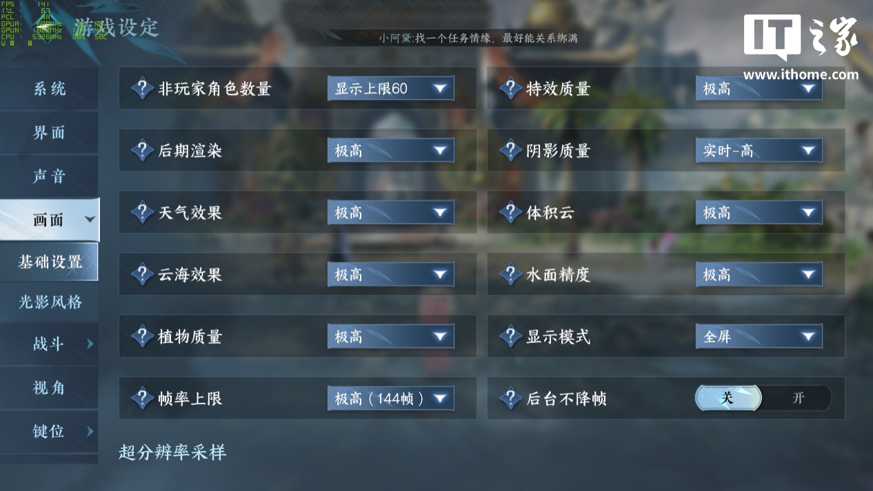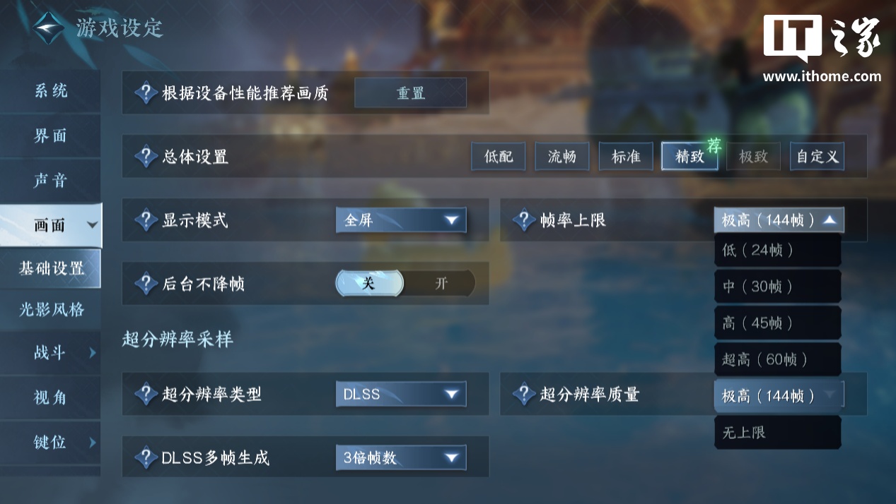 进入游戏后第一步打开设置,看看画面选项相较上一次有何变化。首先,在基础设置中,帧率上限已开放 144 帧(极高)档位和无上限档位。