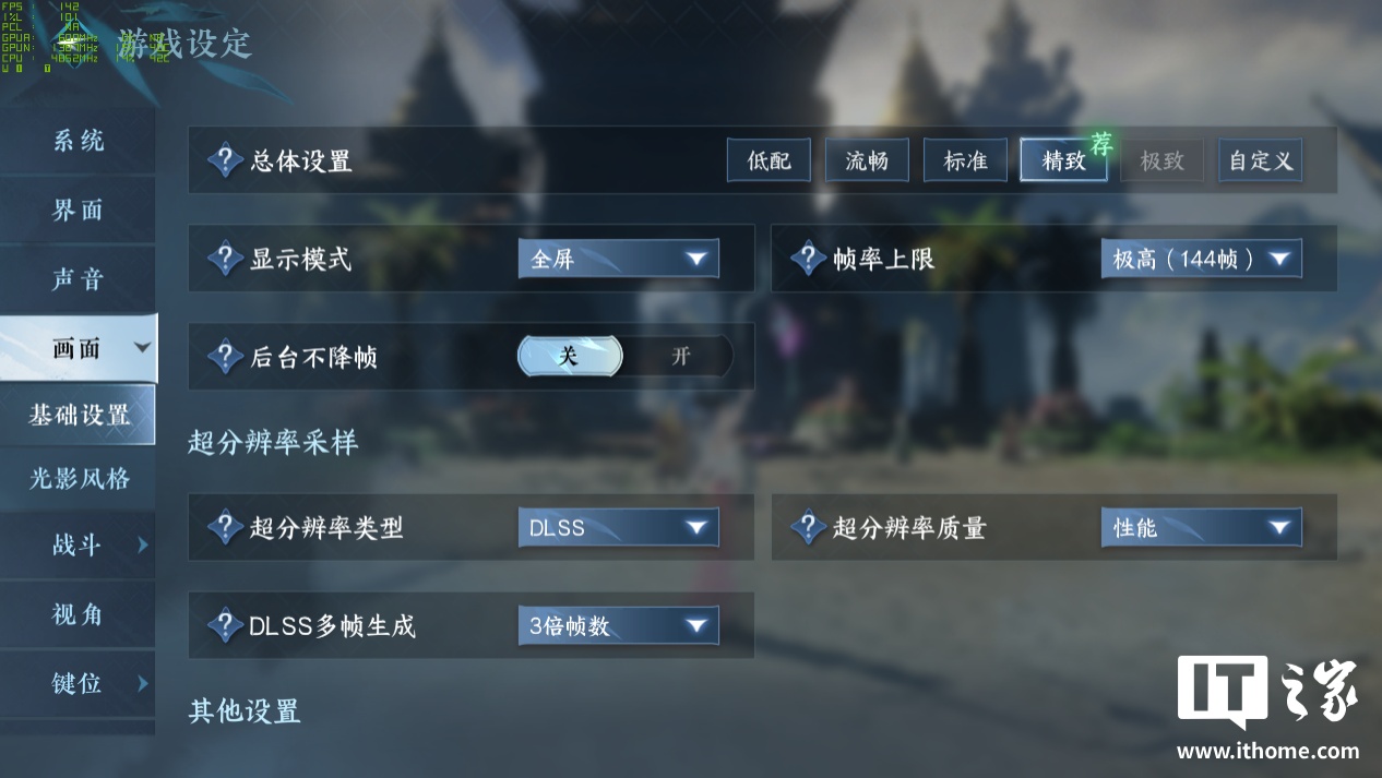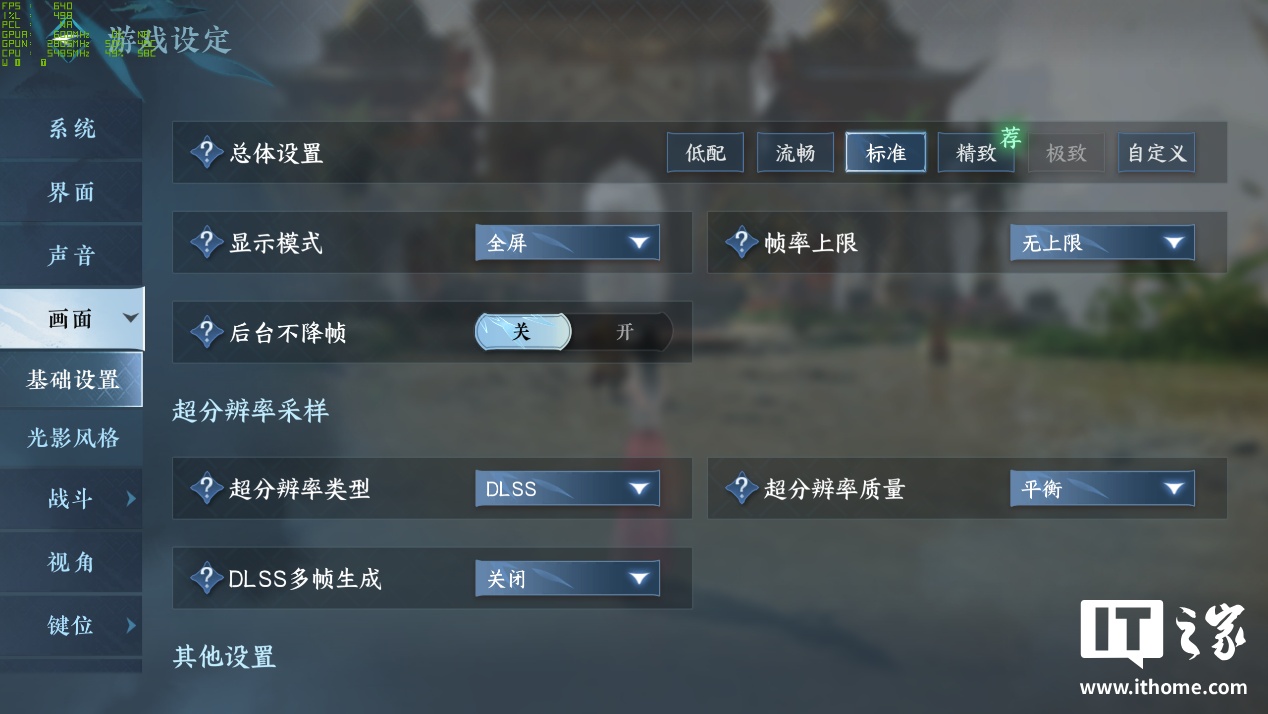 而在基础设置中为照顾实际体验,DLSS 选项的测试环境为 DLSS 原生超分 + 3 倍帧数。场景方面我们对新旧地图均有测试,新地图自然是选择面积最大的南陀岛了。