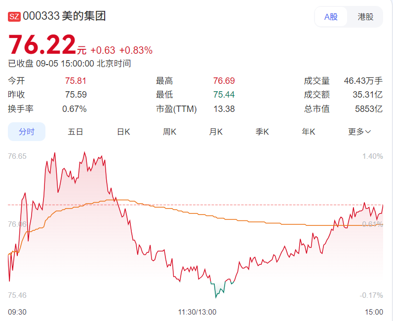 ▲ 图源美的官网IT之家查询获悉,截至 9 月 5 日收盘,美的集团 A 股股价 76.22 元人民币,总市值 5853 亿元人民币。