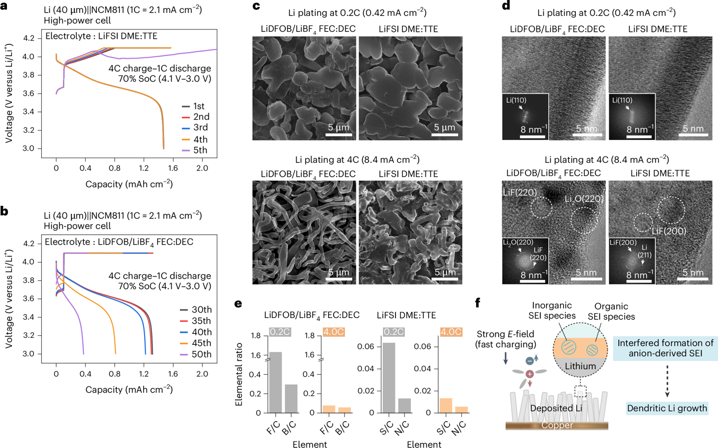 研究团队通过深入机理研究,发现枝晶生长由“锂金属表面不均匀的界面内聚力”触发。基于这项发现,团队创新性地开发出一种“抑制内聚力的新型液态电解质”,其阴离子结构对锂离子结合亲和力较弱,从而确保锂在阳极上均匀沉积,即便在快速充电过程中也能有效抑制枝晶形成。