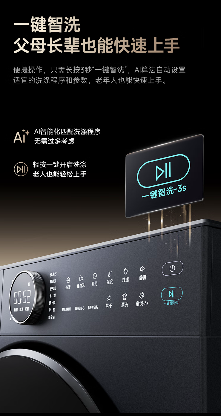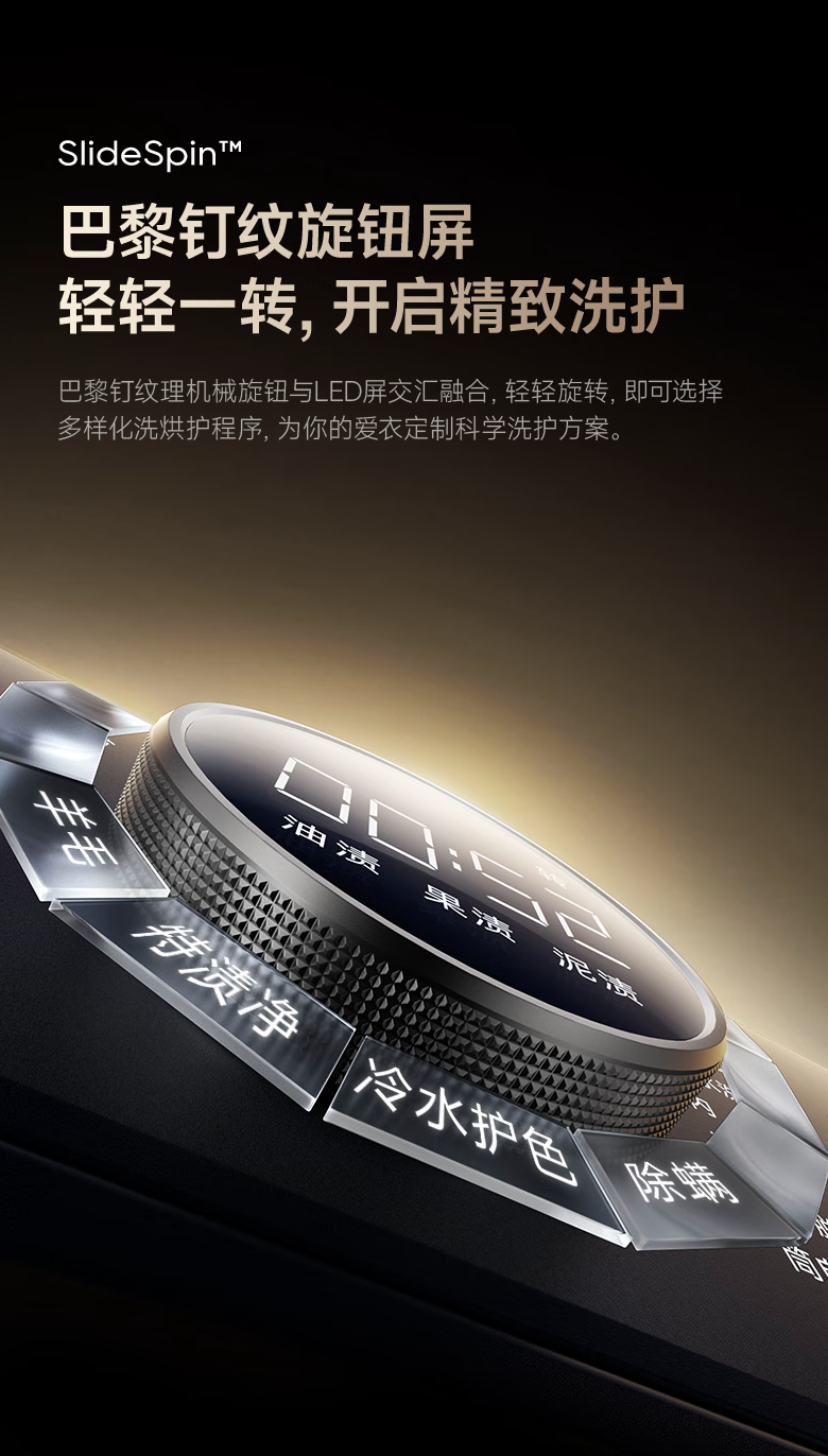 据介绍,这款洗烘一体机的机身纤薄至 540mm,可全隐嵌入 600mm 标准柜体,其配备“巴黎钉纹旋钮屏”(集成了数显屏的旋钮),可便捷选择洗护程序。