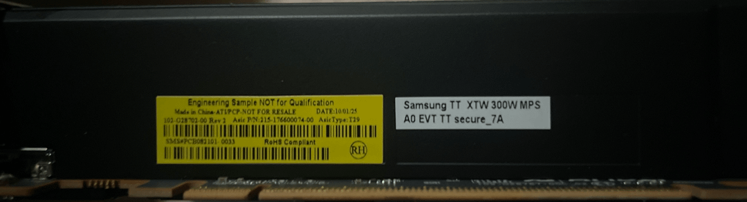 可以看到该显卡是一张不用于认证的 A0 步进工程验证测试 (EVT) 阶段工程样品 (ES),日期应是 2025 年 1 月 10 日,搭载三星半导体显存。