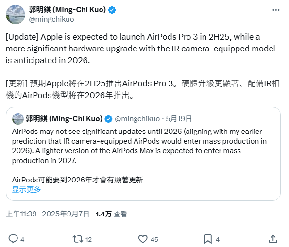 同时,郭明錤还重申了此前的观点。他认为全新的、硬件升级更显著、配备 IR 红外摄像头的 AirPods 新品将于 2026 年推出;轻量版本的 AirPods Max 则预计 2027 年量产,IT之家后续将保持关注。
