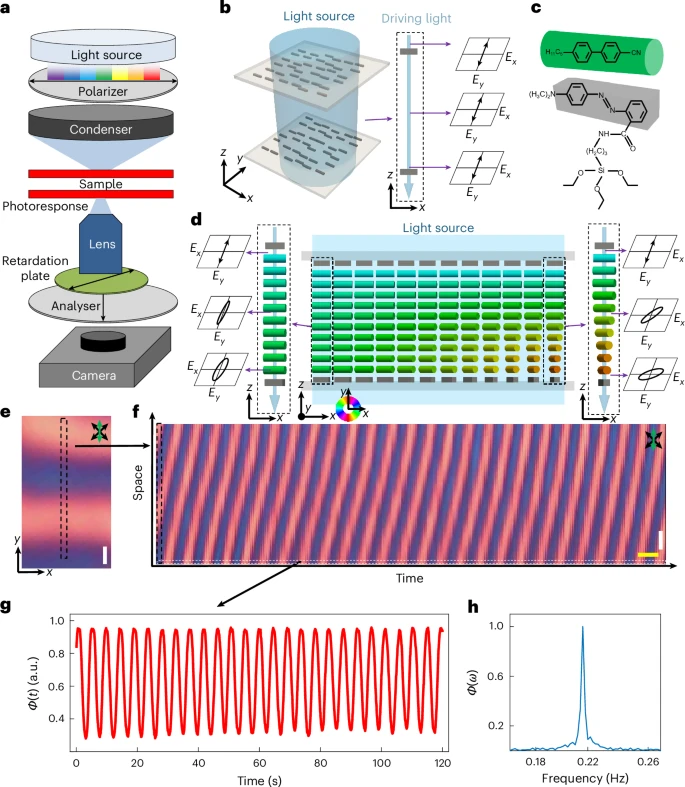 在实验中,研究人员将棒状液晶分子置于涂有染料分子的玻璃片之间。在特定光线照射下,这些液晶分子自发形成随时间重复的螺旋运动,产生大量新的“扭结”结构。这些扭结不仅能长时间维持运动,还会彼此作用,从而形成类似舞蹈般不断循环的复杂动态图案。