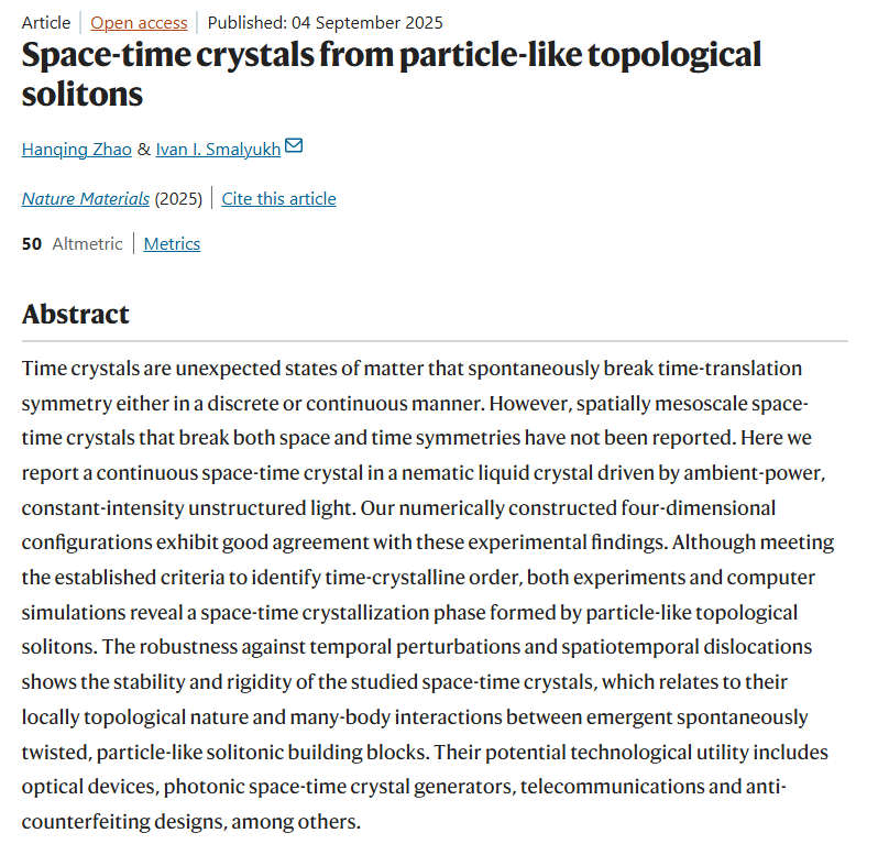 ▲ 随时间运动的时间晶体IT之家查询获悉,相关研究结果已于 9 月 4 日发表在《自然・材料》上,论文第一作者为华人、科罗拉多大学物理系博士生赵汉卿(Hanqing Zhao)。