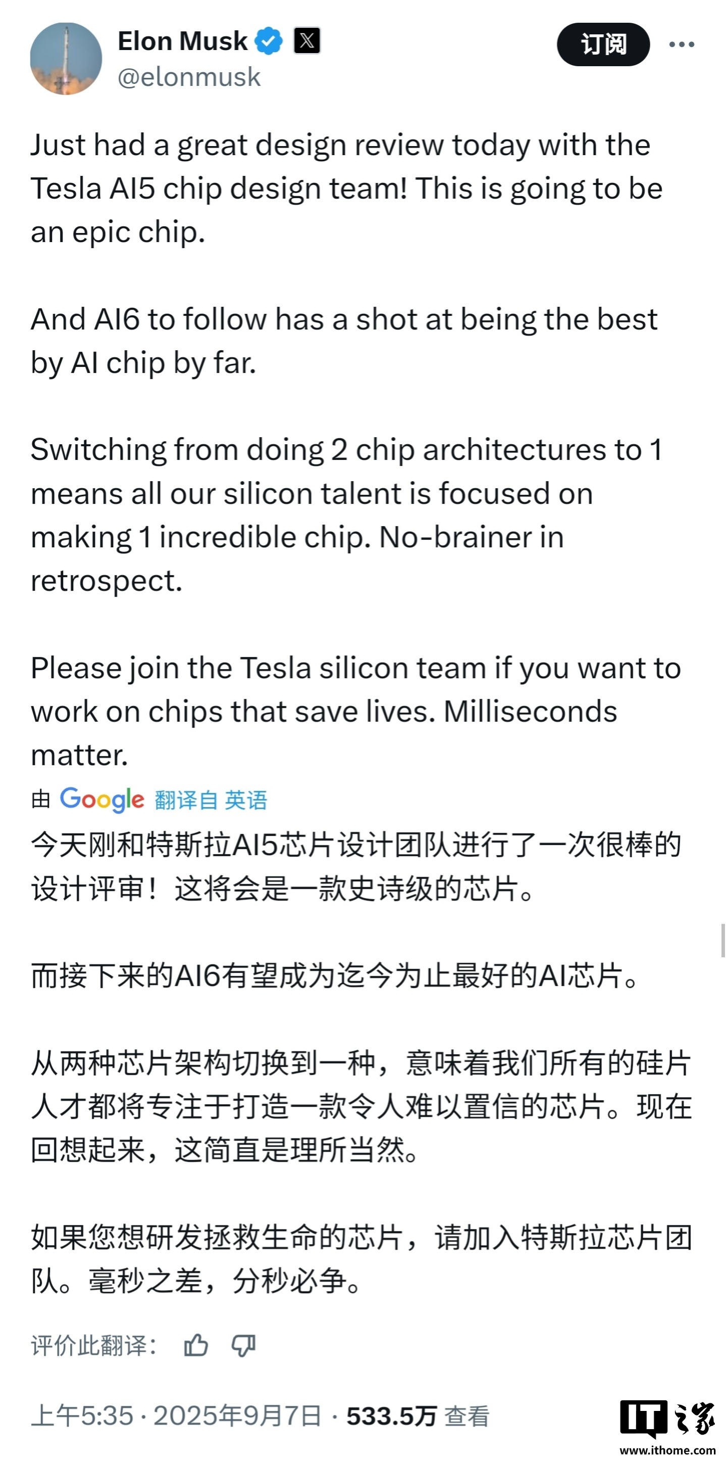 IT之家 9 月 7 日消息,今日,马斯克发文称刚和特斯拉 AI5 芯片设计团队进行了一次很棒的设计评审,并声称“这将会是一款史诗级的芯片。”他还表示,接下来的 AI6 有望成为迄今为止最好的 AI 芯片。