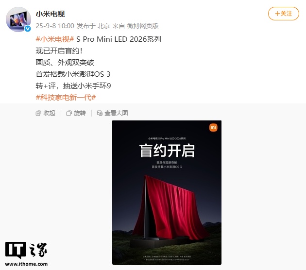 IT之家 9 月 8 日消息,小米电视今日宣布 S Pro Mini LED 2026 系列现已开启盲约,画质、外观双突破