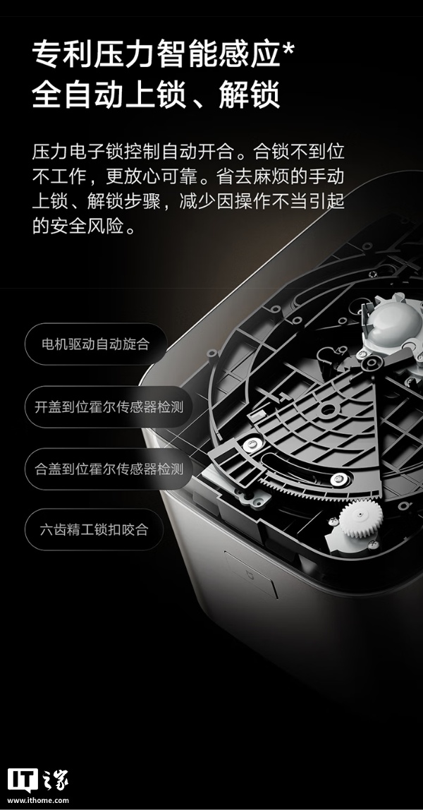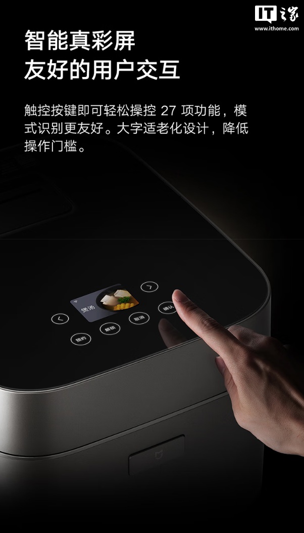 智能化方面,这款电饭煲还支持米家 App、小爱同学远程操控,可将云食谱下发到主机和多端数据同步,机身还拥有彩色屏幕,内置触控按键,还搭载压力电子锁,省去麻烦的手动上锁、解锁步骤。