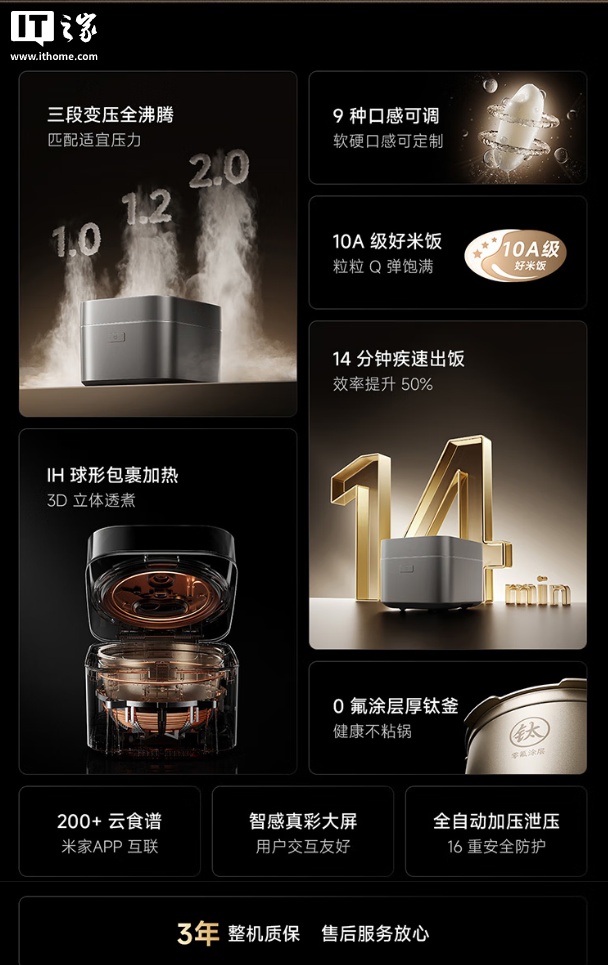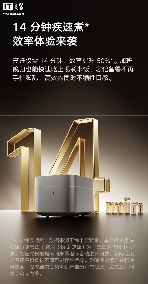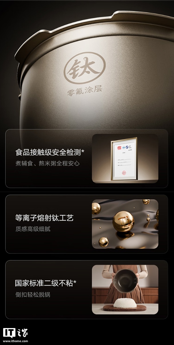 这款电饭煲还支持 1390W 大功率加热,内置 14000mm 超长 IH 线圈,煮好米饭后可保温 8 小时,搭载快煮技术,可在 14 分钟内烹饪一锅米饭,效率提升 50%,其锅体采用 0 氟涂层厚钛,厚度达 3mm,重金属 0 析出,家人饮食更安心。