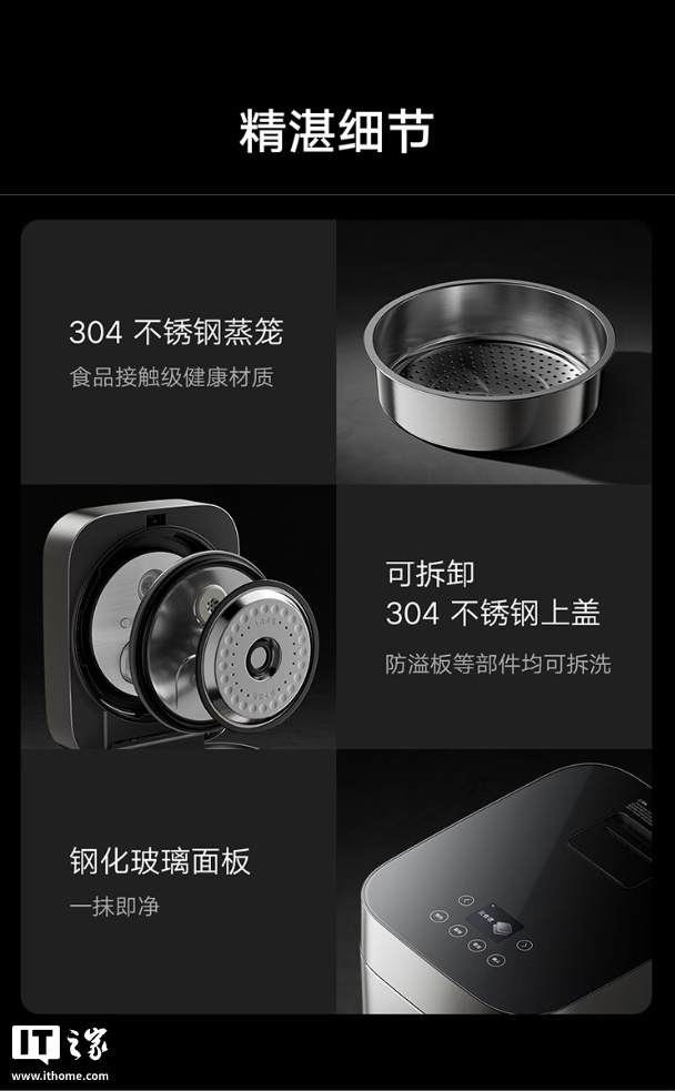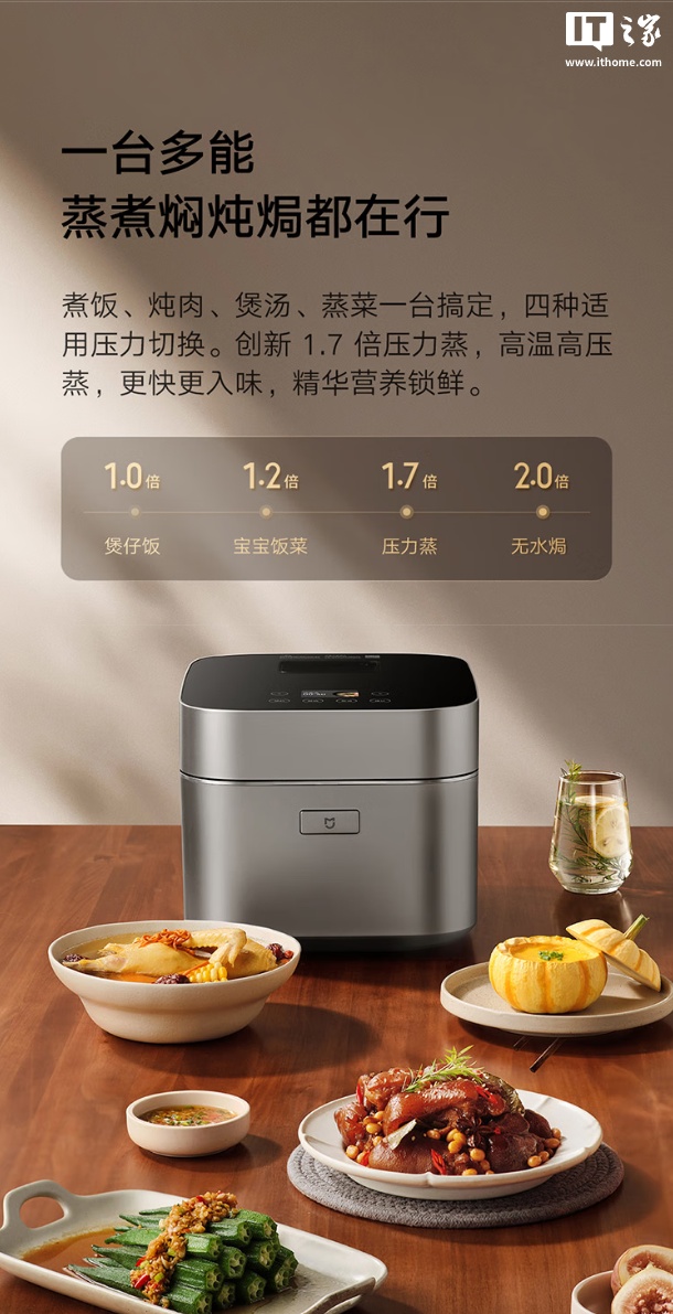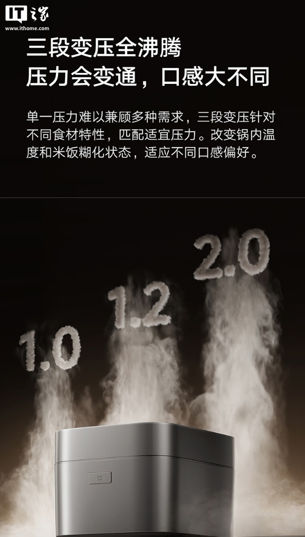 据小米介绍,这款电饭煲是品牌首款智能变压 IH 电饭煲,它可根据不同食材特性,匹配 1.0、1.2、2.0 倍压力,改变锅内温度和米饭糊化状态,定制软硬口感。电饭煲还拥有专利持久沸腾技术,可提升米饭香气、蓬松度。